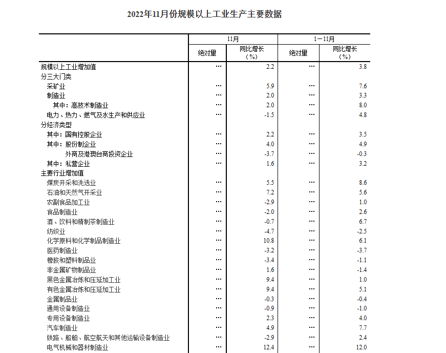 12月15日,國家統(tǒng)計局發(fā)布《2022年11月份規(guī)模以上工業(yè)增加值增長2.2%》。統(tǒng)計顯示,2022年1-11月全國絕對發(fā)電量為76286億千瓦時,同比增長2.1%。其中風電發(fā)電量6145億千瓦時,占比總發(fā)電量約8%,光伏發(fā)電量2125,占比總發(fā)電量約3%。