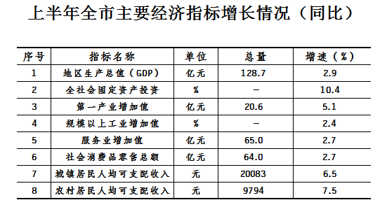 2022年上半年,我市實(shí)現(xiàn)地區(qū)生產(chǎn)總值128.7億元,同比增長(zhǎng)2.9%;全社會(huì)固定資產(chǎn)投資同比增長(zhǎng)10.4%;第一產(chǎn)業(yè)增加值20.6億元,同比增長(zhǎng)5.1%;規(guī)模以上工業(yè)增加值同比增長(zhǎng)2.4%;服務(wù)業(yè)增加值65億元,同比增長(zhǎng)2.7%;社會(huì)消費(fèi)品零售總額64億元,同比增長(zhǎng)2.7%;城鎮(zhèn)居民人均可支配收入20083元,同比增長(zhǎng)6.5%;農(nóng)村居民人均可支配收入9794元,同比增長(zhǎng)7.5%。