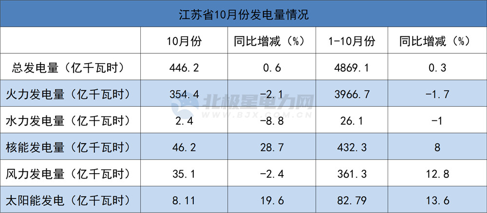 1-10月,總發(fā)電量4869.1億千瓦時,同比增長0.3%;其中,火電發(fā)電量3966.7億千瓦時,同比減少1.7%;水力發(fā)電量26.1億千瓦時,同比減少1%;風力發(fā)電量361.3億千瓦時,同比增長12.8%;太陽能發(fā)電量82.79億千瓦時,同比增長13.6%;核電發(fā)電量46.2億千瓦時,同比增長28.7%。