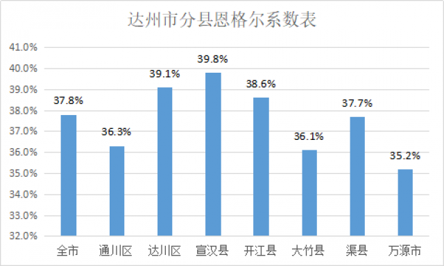 按照國際標(biāo)準(zhǔn),恩格爾系數(shù)達(dá)到30-40%為富裕,經(jīng)計(jì)算2021年達(dá)州市平均水平達(dá)到37.8%,各縣區(qū)均在30-40%之間(詳見下表),數(shù)據(jù)表明全市均跨入富裕地區(qū),其中達(dá)川區(qū)居民恩格爾系數(shù)為39.1%,比2020年降低2個(gè)百分點(diǎn),居民生活水平整體呈現(xiàn)提升狀態(tài)。
