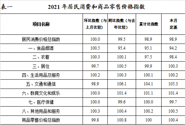 2021年居民消費(fèi)價(jià)格總指數(shù)同比下降1.1%。其中,食品煙酒類價(jià)格下降4.9%,衣著類價(jià)格下降2.5%,居住類價(jià)格下降0.1%,生活用品及服務(wù)價(jià)格上漲0.1%,交通和通信類價(jià)格上漲4.1%,教育文化用品及娛樂類價(jià)格上漲1.1%,醫(yī)療保健類價(jià)格與去年同期持平,其他用品和服務(wù)類價(jià)格上漲0.2%。商品零售價(jià)格總指數(shù)與去年同期持平。
