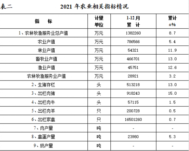 2021年農(nóng)林牧漁服務(wù)業(yè)總產(chǎn)值1382260萬(wàn)元,比上年增長(zhǎng)8.7%。其中,農(nóng)業(yè)產(chǎn)值786566萬(wàn)元,增長(zhǎng)5.4%;林業(yè)產(chǎn)值54321萬(wàn)元,增長(zhǎng)11.9%;畜牧業(yè)產(chǎn)值466701萬(wàn)元,增長(zhǎng)13.0%;漁業(yè)產(chǎn)值45751萬(wàn)元,增長(zhǎng)12.6%;農(nóng)林牧漁業(yè)服務(wù)業(yè)產(chǎn)值28921萬(wàn)元,增長(zhǎng)3.2%。