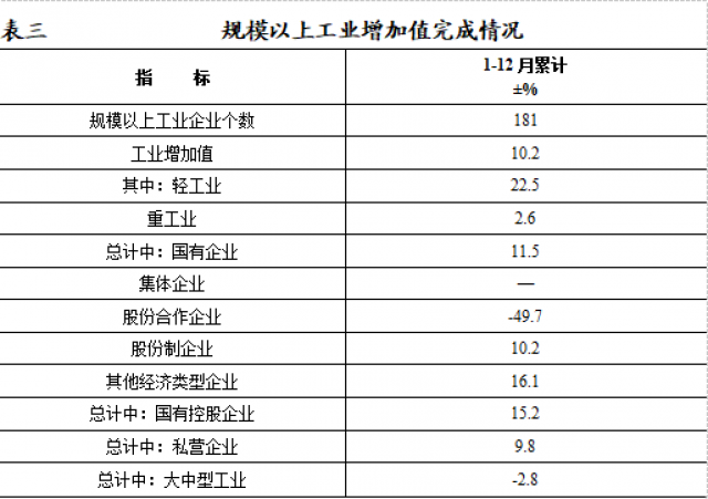 工業(yè)全年增加值668309萬元,同比增長8.4%。其中,規(guī)模以上工業(yè)增加值同比增長10.2%。在規(guī)模以上工業(yè)中,輕工業(yè)增加值同比增長22.5%,重工業(yè)增加值同比增長2.6%。按經(jīng)濟(jì)類型分,國有企業(yè)同比增長11.5%,國有控股企業(yè)增加值同比增長15.2%,股份制企業(yè)同比增長10.2%,私營企業(yè)同比增長9.8%。按門類分,采礦業(yè)下降17.4%,制造業(yè)增長15.2%,電力、熱力、燃?xì)饧八a(chǎn)和供應(yīng)業(yè)增長17.8%。