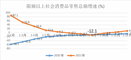 1-12月,限額以上社會(huì)消費(fèi)品零售總額完成21.19億元,同比增長(zhǎng)9.4%,增速較1-11月提高6.4個(gè)百分點(diǎn),兩年平均增速1.7%。分行業(yè)情況:限額以上批發(fā)業(yè)銷售額完成26.71億元,同比增長(zhǎng)6%;限額以上零售業(yè)商品銷售額完成22.23億元,同比增長(zhǎng)37.6%;限額以上住宿業(yè)營(yíng)業(yè)額完成0.4億元,同比增長(zhǎng)12.8%;限額以上餐飲業(yè)營(yíng)業(yè)額完成0.95億元,同比增長(zhǎng)29.4%。