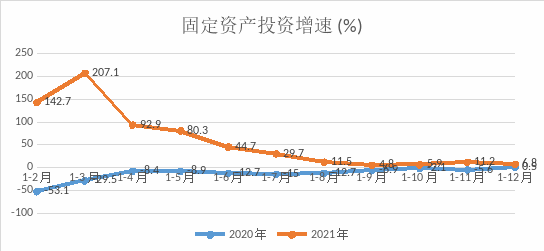 2.固定資產(chǎn)投資。1-12月,固定資產(chǎn)投資同比增長(zhǎng)6.8%,增速較1-11月回落4.4個(gè)百分點(diǎn),兩年平均增速3.6%。第一產(chǎn)業(yè)完成投資同比下降54.4%;第二產(chǎn)業(yè)完成投資同比增長(zhǎng)277.8%;第三產(chǎn)業(yè)完成投資同比下降6.4%。