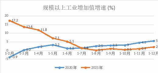 1.規(guī)模以上工業(yè)。1-12月,規(guī)模以上工業(yè)增加值同比增長(zhǎng)2%,較1-11月提高1.1個(gè)百分點(diǎn),兩年平均增速3.7%。