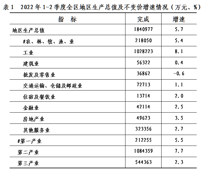經(jīng)初步核算,全區(qū)實現(xiàn)生產總值184.1億元,不變價增長5.7%。其中:實現(xiàn)第一產業(yè)增加值21.23億元,不變價增長5.5%;第二產業(yè)增加值108.44億元,不變價增長7.7%;第三產業(yè)增加值54.44億元,不變價增長2.3%。