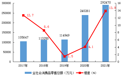 全年社會消費品零售總額同比增長13.9%。其中:批發(fā)業(yè)商品銷售額同比增長10.3%;零售業(yè)商品銷售額同比增長15.3%;住宿業(yè)營業(yè)額同比增長20.5%;餐飲業(yè)營業(yè)額同比增長31.5%。