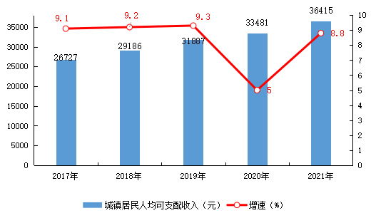 圖10:2017年-2021年城鎮(zhèn)居民人均可支配收入及增速
