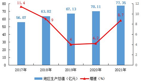 2021年實現(xiàn)地區(qū)生產(chǎn)總值77.35億元,按可比價計算,同比增長8.7%。其中:第一產(chǎn)業(yè)實現(xiàn)增加值20.86億元,同比增長7.4%;第二產(chǎn)業(yè)實現(xiàn)增加值14.49億元,同比增長3.2%;第三產(chǎn)業(yè)實現(xiàn)增加值42億元,同比增長11.3%。