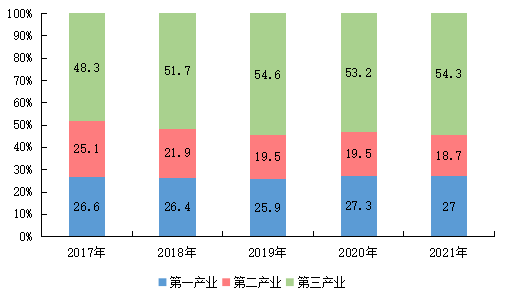 圖2:2017年-2021年三次產(chǎn)業(yè)增加值占地區(qū)生產(chǎn)總值比重