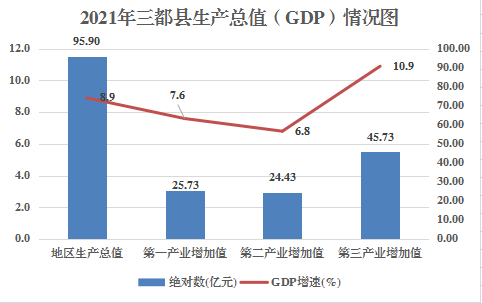 根據(jù)縣(市)生產(chǎn)總值統(tǒng)一核算結(jié)果,2021年三都縣生產(chǎn)總值為95.9億元,同比增長8.9%,兩年平均增長5.4%。其中,第一產(chǎn)業(yè)增加值為25.73億元,同比增長7.6%,兩年平均增長6.8%;第二產(chǎn)業(yè)增加值為24.43億元,同比增長6.8%,兩年平均增長2.0%;第三產(chǎn)業(yè)增加值為45.73億元,同比增長10.9%,兩年平均增長6.9%。