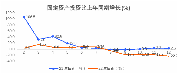 投資方面。1-12月固定資產(chǎn)投資完成同比下降22.7%。其中,產(chǎn)業(yè)投資占比43.7%,民間投資占比22.5%。按主要行業(yè)分:工業(yè)投資下降47.6%;基礎(chǔ)設(shè)施投資下降8.8%。