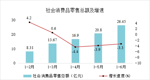 上半年,全社會(huì)消費(fèi)品零售總額26.45億元,同比下降3.3%,降幅較上月收窄0.6個(gè)百分點(diǎn),速度低于全州(-0.2%)3.1個(gè)百分點(diǎn),排全州八縣(市)第7位。按銷售所在地分,城鎮(zhèn)市場零售額13.59億元,同比下降7.4%;鄉(xiāng)村市場零售額12.86億元,同比下降1.4%。從行業(yè)情況看,批發(fā)、零售業(yè)銷售額分別為4.49億元、18.8億元,同比分別增長17.1%、0.7%;住宿、餐飲業(yè)營業(yè)額分別為0.67億元、3.68億元,同比分別增長7.1%、2.3%。