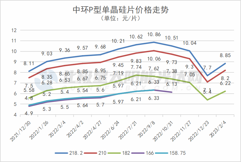 2月4日,TCL中環(huán)發(fā)布了最新的單晶硅片價(jià)格,硅片價(jià)格全線上漲。其中,P型150μm硅片182、210、218.2分別上漲至6.22元/片、8.2元/片、8.85元/片;N型130μm厚度硅片182、210分別上漲至6.39元/片、8.35元/片;N型150μm硅片厚度減薄至140μm,182、210尺寸報(bào)價(jià)分別為6.52元/片、8.52元/片。