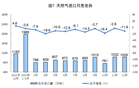 天然氣生產(chǎn)增速有所放緩,進口降幅擴大。12月份,生產(chǎn)天然氣204億立方米,同比增長6.5%,增速比上月放緩2.1個百分點,日均產(chǎn)量6.6億立方米。進口天然氣1028萬噸,同比下降11.8%,降幅比上月擴大9.0個百分點。